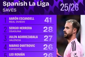 24直播網(wǎng)10月07日訊 Squawka統(tǒng)計(jì)顯示,西甲撲救榜上,皇家?jiàn)W維耶多門將埃斯坎德?tīng)栆?1次撲救高居榜首。奧薩蘇納的塞爾吉奧-埃雷拉以28次位列第二,瓦倫西亞的阿吉雷薩巴拉以27次緊隨其后。該數(shù)據(jù)反映了各隊(duì)門將在本賽季的活躍程度。