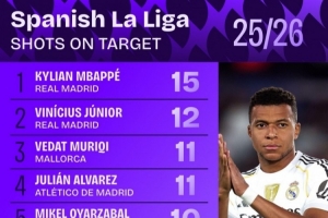 24直播網(wǎng)10月07日訊 根據(jù)Squawka統(tǒng)計(jì),本賽季西甲射正次數(shù)排行中,皇馬前鋒姆巴佩以15次高居榜首。維尼修斯以12次位列第二,穆里奇與阿爾瓦雷斯并列第三(11次)。巴薩球員表現(xiàn)搶眼,萊萬、拉什福德和費(fèi)蘭-托雷斯均進(jìn)入前十,展現(xiàn)了球隊(duì)的進(jìn)攻火力。