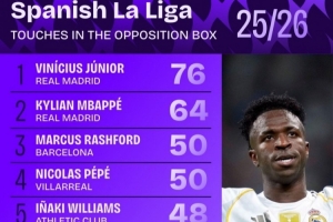 24直播網10月07日訊 根據Squawka統計,皇馬前鋒維尼修斯以76次禁區觸球次數領跑西甲。新援姆巴佩以64次位居次席,拉什福德與佩佩并列第三(50次)。此數據反映了皇馬雙星在前場的活躍度與核心地位,凸顯了他們在球隊進攻體系中的關鍵作用。
