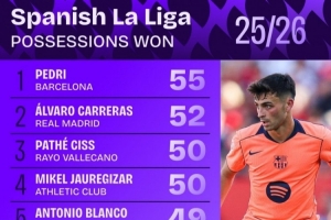 24直播網10月07日訊 根據Squawka統計,本賽季西甲奪回球權次數排行出爐。巴薩小將佩德里以55次高居榜首,皇馬新星卡雷拉斯以52次緊隨其后。巴列卡諾的帕特-西斯與畢爾巴鄂的豪雷吉薩爾并列第三,均完成50次搶斷。該榜單展現了各隊中場球員的防守貢獻與活力。