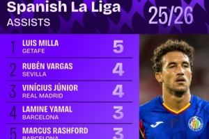 24直播網10月07日訊 根據Squawka統計,本賽季西甲助攻榜上,赫塔費的路易斯-米拉以5次助攻領跑。皇家維尼修斯與塞維利亞的巴爾加斯同以4次助攻并列第二。巴塞羅那的亞馬爾、拉什福德(巴薩)以及皇馬的居勒爾等球員則以3次助攻并列第四。