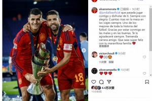 莫拉塔社媒曬出與阿爾巴在西班牙隊的合照,并寫道:“與你并肩作戰、共享歡樂的時光何其珍貴,你總是充滿快樂,旅途餐桌上歡聲笑語不斷。你是足球歷史上最杰出的球員之一。”