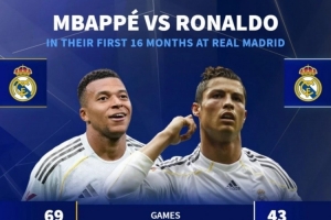 24直播網10月08日訊 姆巴佩皇馬生涯前16個月數據亮眼:出戰69場,貢獻58球7助,場均參與0.94球,效率超越同期C羅(43場36球13助,場均1.14球)。雖德轉身價(1.8億歐)是C羅當時(9000萬歐)的兩倍,但C羅參與進球效率更高。
