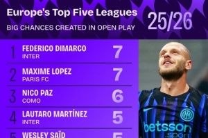 24直播網10月09日訊 根據Squawka統計,本賽季五大聯賽創造重大機會次數排名出爐。迪馬爾科與洛佩斯以7次并列榜首,尼科-帕斯以6次位列第三。勞塔羅、凱恩等9名球員以5次并列第四,展現了高效的進攻創造力。