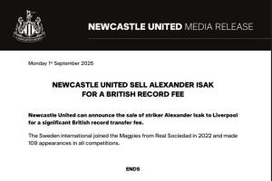 紐卡官網的聲明:“紐卡斯爾聯宣布將前鋒亞歷山大-伊薩克以創英國轉會費紀錄的價格出售給利物浦。這位瑞典國腳于2022年從皇家社會轉會至喜鵲,并在各項賽事中出場109次。”