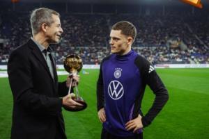 24直播網10月11日訊 世預賽德國4-0大勝盧森堡。賽前,核心球員維爾茨榮膺2025德國足球先生,他以191票的絕對優勢當選,遠超第二名奧利塞。他憑借上賽季在勒沃庫森的出色表現(16球15助)獲此殊榮。