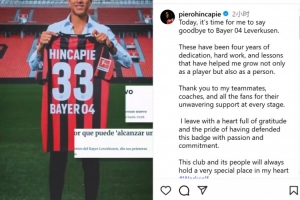 體育資訊9月2日訊 阿森納已經官宣引進勒沃庫森中衛因卡皮耶,后者也通過社媒發文向藥廠告別: