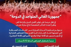 我們邀請您在阿聯酋足球協會為阿聯酋球迷免費提供的位于麗笙酒店(喬安娜廳)和喜來登酒店(馬吉利斯廳)的巨型屏幕上關注比賽動態。我們將于18:15(22:15)開始接待公眾。”