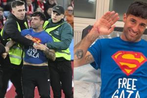 24直播網10月12日訊 挪威5-0大勝以色列的歐洲區預選賽中,一名球迷沖入場內,展示寫著“自由加沙”的T恤,抗議以色列并短暫中斷比賽。該球迷馬里奧-費里是慣犯,此前在世界杯也曾因手持彩虹旗、身著“拯救烏克蘭”T恤闖入球場。