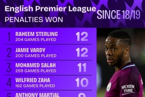 24直播網10月12日訊 根據Squawka統計,自2018-19賽季以來,斯特林與瓦爾迪以12次造點次數并列英超榜首。薩拉赫以11次位列第三,扎哈、馬夏爾等球員緊隨其后。該數據統計了球員在此期間英超的總出場次數及獲得的點球數。
