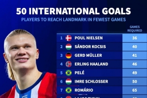 24直播網10月13日訊 哈蘭德以46場國家隊比賽打入50球,位列歷史第四,效率遠超梅西(107場)和C羅(114場)。他僅次于波爾-尼爾森(36場)、柯奇斯(40場)和穆勒(41場),展現了驚人的得分能力。