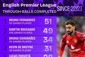 24直播網10月13日訊 根據Squawka數據,自2022/23賽季以來,B費以115場51次成功直塞的數據,高居英超直塞榜首位,厄德高以49次位列第二。該排行榜展現了中場球員在精準長傳方面的能力,B費的表現尤為突出。