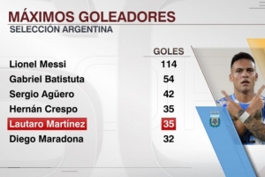 24直播網10月15日訊 勞塔羅在友誼賽中梅開二度,其阿根廷國家隊進球數追平克雷斯波,以35球并列隊史射手榜第四。目前,梅西以114球高居榜首,巴蒂斯圖塔、阿圭羅分列二、三位。