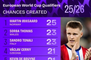 24直播網10月15日訊 據Squawka統計,挪威球星厄德高以25次創造機會,成為本屆歐洲世預賽機會王。他領先于索爾巴-托馬斯、托納利等球員,展現了出色的組織能力,為球隊進攻端注入核心活力。