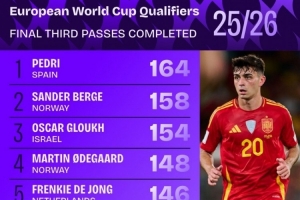 24直播網10月15日訊 根據Squawka數據,在歐洲世預賽進攻三區成功傳球榜中,西班牙中場佩德里以164次成功傳球高居榜首。挪威的桑德-博格與以色列的格勞分列二、三位,厄德高、德容等知名球員也躋身前十。