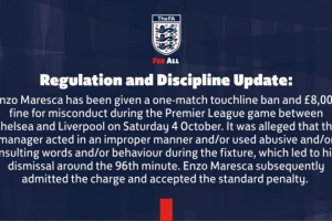 切爾西主教練馬雷斯卡因在10月4日周六對陣利物浦的英超聯賽中存在不當行為,被處以一場場邊禁賽及8000英鎊罰款。該指控指出馬雷斯卡在比賽第96分鐘被罰離場前,存在不當行為或使用侮辱性、攻擊性言語。馬雷斯卡本人已承認指控并接受標準處罰。