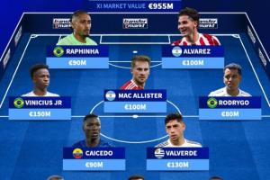中場:凱塞多(9000萬歐)、巴爾韋德(1.3億歐)、麥卡利斯特(1億歐)
