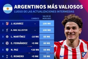 24直播網10月18日訊 德國轉會市場更新了阿根廷球員的身價排名。阿爾瓦雷斯與麥卡利斯特以1億歐并列第一,勞塔羅、恩佐緊隨其后。這份榜單反映了阿根廷球員在當今足壇的高市場價值與強大競爭力。