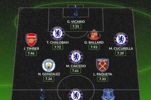 后衛(wèi):廷伯(阿森納,7.46分)、查洛巴(切爾西,7.72分)、丹尼爾-巴拉德(桑德蘭,7.93分)、庫(kù)庫(kù)雷利亞(切爾西,7.39分)