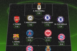 后衛:廷伯(阿森納,7.46分)、T-克里斯滕森(烏迪內斯,7.18分)、查洛巴(切爾西,7.72分)、庫庫雷利亞(切爾西,7.39分)
