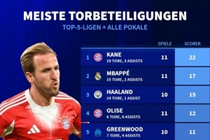 24直播網10月20日訊 根據《轉會市場》統計,本賽季五大聯賽球員參與進球榜出爐。凱恩以11場22球(19球3助)高居榜首,姆巴佩(17球)和哈蘭德(15球)緊隨其后。奧利塞、格林伍德等球員也躋身前十,展現了本賽季的頂級攻擊手表現。