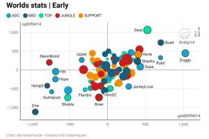體育資訊10月21日訊?外媒發布截至目前世界賽前14分鐘經濟差與經驗差數據圖(其中橫坐標代表經濟差,縱坐標代表經驗差,圖中圓圈大小代表14分鐘的擊殺與助攻數的平均值,以4、1.5、0.4為節點):Zeus經驗差最高;Doggo經濟差最高。