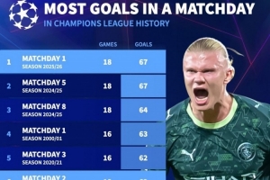 值得一提的是,本賽季歐冠聯賽階段第三輪今日9場比賽出現43粒進球,剩余9場比賽打進25球就可以打破紀錄。