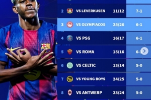 24直播網10月22日訊 巴薩在歐冠6-1大勝奧林匹亞科斯,創下隊史第十大勝績。隊史歐冠最大分勝績紀錄中,7-0凱爾特人及7-1勒沃庫斯曾創巔峰,另有多次5-0以上大勝,展現了其在歐冠賽場的強大統治力。