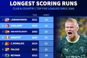 24直播網(wǎng)10月22日訊 哈蘭德歐冠助曼城取勝,已連續(xù)12場(chǎng)破門(mén),追平范尼并逼近萊萬(wàn)14場(chǎng)的新世紀(jì)紀(jì)錄。姆巴佩以11場(chǎng)緊隨其后,C羅、法爾考并列。梅西、內(nèi)馬爾等球星也均曾達(dá)成10場(chǎng)連續(xù)進(jìn)球。