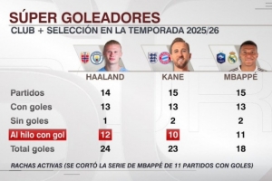 24直播網10月23日訊 ESPN統計了哈蘭德、凱恩、姆巴佩本賽季的數據。哈蘭德14場轟24球并連續12場破門;凱恩15場進23球,連續10場破門;姆巴佩15場進18球。哈蘭德在進球數和連續進球場次上暫居榜首。
