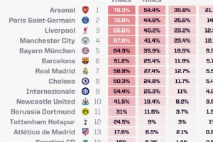 24直播網10月23日訊 歐冠第三輪后,Opta超級計算機更新奪冠概率。阿森納以21.13%高居榜首,巴黎(14.03%)與利物浦(12.31%)分列二、三位,曼城(12.12%)緊隨其后。拜仁、巴薩、皇馬等傳統豪門位列其后。