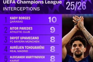 24直播網(wǎng)10月23日訊 歐冠第3輪后,數(shù)據(jù)公布攔截榜。卡迪-博爾熱斯以10次居首,艾托爾-帕雷德斯、于帕梅卡諾與瓊阿梅尼同列第二至第四位。拜仁與皇馬的中衛(wèi)及中場球員防守積極,展現(xiàn)出色攔截能力。