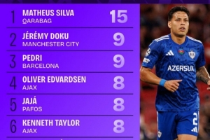24直播網10月23日訊 歐冠聯賽前三輪戰罷,卡拉巴赫后衛馬修斯-席爾瓦以15次被犯規高居榜首。曼城的多庫與巴薩的佩德里均被犯規9次,并列第二。此外,阿賈克斯的埃德瓦森、切爾西的恩佐等8名球員均被犯規8次,共同位列榜單前列。