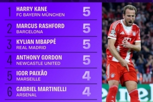 24直播網10月23日訊 歐冠聯賽階段前三輪戰罷,參與進球榜揭曉。凱恩、拉什福德、姆巴佩與安東尼-戈登以5球的數據暫列榜首。哈蘭德、馬丁內利等4球球員緊隨其后。