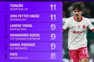 24直播網10月23日訊 歐冠聯賽階段前三輪戰(zhàn)罷,Squawka統計完成過人榜。葡萄牙體育前鋒特林康與博德閃耀攻擊手海于格均以11次成功過人并列榜首。巴塞羅那新星亞馬爾、熱刺的庫杜斯和奧林匹亞科斯的波登斯以9次并列第三。