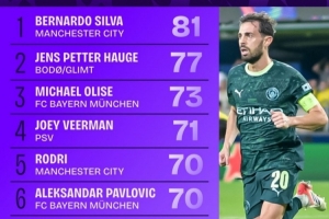 24直播網10月23日訊 歐冠聯賽階段前三輪戰罷,Squawka統計進攻三區傳球數。曼城B席以81次居首,博德閃耀的海于格77次次席,拜仁奧利塞73位列第三。曼城球員包攬前五中的四席,羅德里、尼科-岡薩雷斯和格瓦迪奧爾均進入前十。