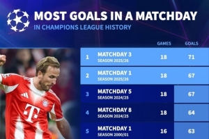 24直播網10月23日訊 最新一輪歐冠比賽共打進71球,創下歐冠單輪歷史最高進球紀錄。該數據位列歷史單輪進球榜首位,超越了此前67球的紀錄。這標志著本輪賽事成為歐冠歷史上進球最多的一輪。