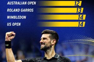 據(jù)統(tǒng)計(jì),德約生涯一共53次晉級(jí)大滿貫四強(qiáng),其中澳網(wǎng)12次、法網(wǎng)13次、溫網(wǎng)和美網(wǎng)均14次。