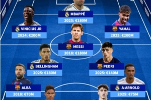 24直播網10月24日訊 德國轉會市場盤點了皇馬與巴薩歷史最高身價陣,總價值14.8億歐元。陣容中包括梅西、C羅、姆巴佩等巨星,亞馬爾與維尼修斯以2億歐元居首。貝林厄姆與梅西同為1.8億歐元,佩德里1.4億歐元。門將特爾施特根及阿爾巴、瓦拉內等后衛(wèi)也悉數(shù)在列,為西班牙國家德比預熱。