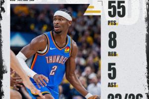 本場比賽,雷霆當家球星亞歷山大一展雙MVP風采,攻防俱佳,戰力十足,末節&加時頻頻取分,砍下生涯新高的55分&罰球數生涯新高26記,同時成為本賽季全聯盟首位50分先生!