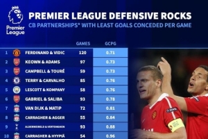 24直播網10月24日訊 《轉會市場網》統計了英超歷史場均丟球最少的20組中后衛搭檔(需合作50場以上)。曼聯的費迪南德與維迪奇以場均僅0.71球高居榜首,阿森納基翁與亞當斯、索爾-坎貝爾與圖雷緊隨其后。切爾西、利物浦、曼城等豪門強檔的防守組合也悉數上榜。