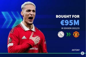 2022年夏窗,曼聯以9500萬歐元從阿賈克斯引進安東尼,今夏以2200萬歐將其賣給貝蒂斯。凈虧7300萬歐。