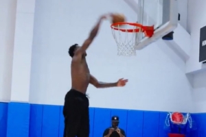 視頻中馬瑟林赤裸著上身進行有球訓練,他的打板大戰斧劈扣讓人賞心悅目,節奏變化下的跳投也是把握十足。
