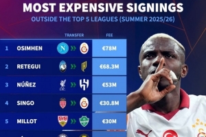 體育資訊9月4日訊 德國轉會市場列出了今夏五大聯賽之外球隊的最貴引援排名,奧斯梅恩居首,雷特吉次席。