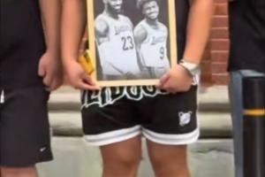 有網(wǎng)友曬出視頻,視頻中有球迷拿著詹姆斯和布朗尼的黑白合照在外灘駐足等待。