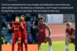 薩拉赫寫道:“你的忠誠和每一次上場所表現出來的投入將會被銘記,你作為一個冠軍離開,我毫不懷疑你會在新東家成就偉大事業,擁有你是他們的幸運。”