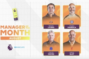 8月英超賽程,布里斯率領桑德蘭取得2勝1負戰績;馬雷斯卡率領切爾西取得2勝1平;莫耶斯的埃弗頓取得2勝1負;斯洛特帶領利物浦取得3戰全勝,是目前英超唯一全勝隊伍。