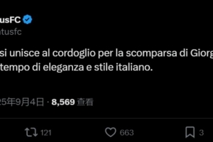 尤文官方寫道:“尤文圖斯俱樂部對喬治-阿瑪尼的逝世表示哀悼,他是意大利優(yōu)雅與風格的永恒象征。”