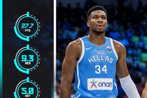 今年歐錦賽至今,字母哥出戰3場比賽,效率非常變態,他場均上陣28.7分鐘可以砍下27.7分9.7籃板5助攻1搶斷,投籃命中率是69.6%,三分命中率為100%(1中1),罰球命中率是62.1%,場均正負值+18,場均效率值為32.3%。