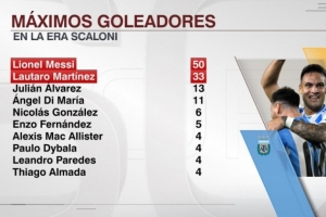 據ESPN統計,斯卡洛尼執教以來,梅西打進50球阿根廷隊內最多,勞塔羅攻入33球第二多。